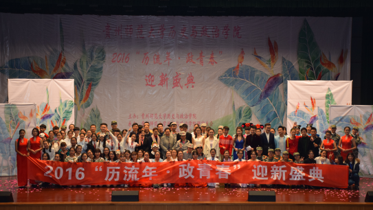 迟来的欢迎,意味着我们付出加倍的努力;不在开头,是为了更多的精彩!为迎接2016级新生的到来,12月2日晚,bb贝博艾弗森官方网站2016“历流年·政青春”迎新晚会在花溪校区大礼堂顺利举行。学院党委书记杨芳、院长阳黔花、党委副书记廖光珍、副院长蒲文彬、副院长陈华森出席。学院师生共1000余人参加了本次晚会。