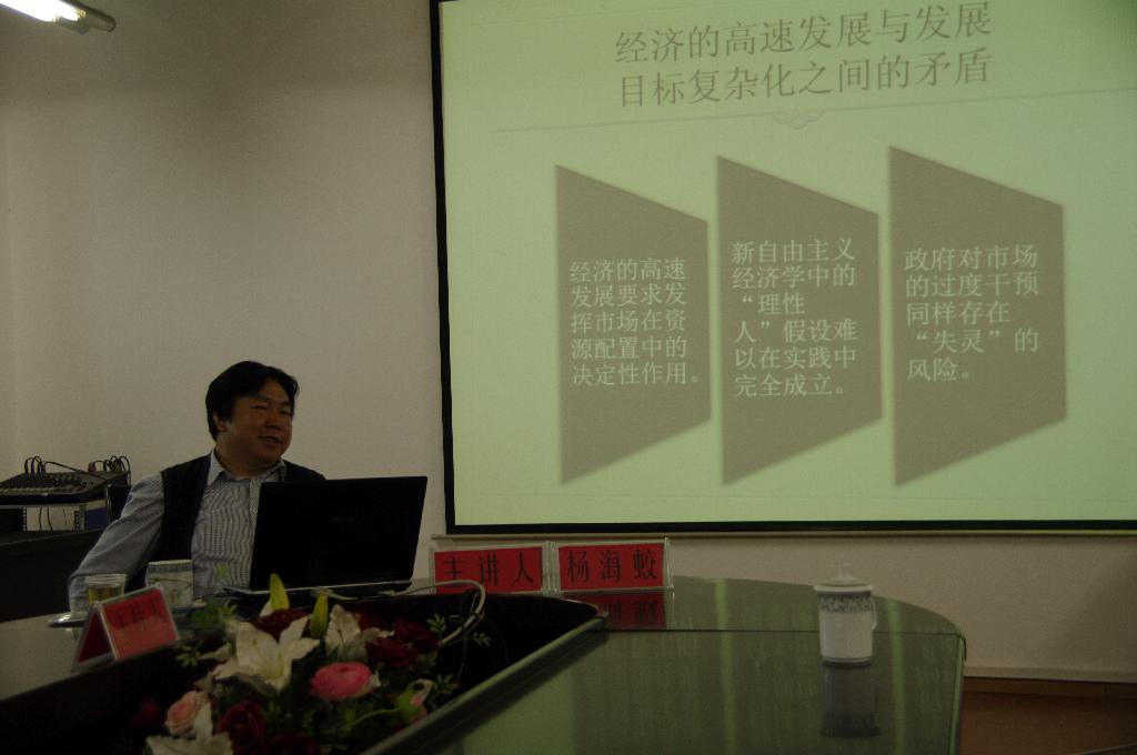 杨教授从自己的笔名“洋龙”、“郑言”、“郑慧”、“华龙心”、“师泽生”、“小苗”等谈起,向在座师生介绍了自己的学术生涯,劝诫研究生同学在发表自己观点的时候要有独特的深度、高度与维度;在读书的过程中要坚定马克思主义的政治立场,培养命题的经典意识、责任意识、创新意识、问题意识;通过读原创性与划时代意义的著作来不断成长自己、塑造自己,做一个大彻大悟、大仁大义、大慈大悲的人。随后,杨教授针对推进国家治理体系与治理能力现代化的紧迫性与必要性作了详细的解读。他认为目前我们在国家治理的过程中面临着公共需求的日益多样化与政府组织的有限容量之间的矛盾、威胁国家安全稳定的因素越来越多与责任主体的相对单一之间的矛盾、国际“软实力”竞争日趋激烈与中国制度优势尚未完全彰显之间的矛盾。因此,有必要构建科学合理的国家治理体系。