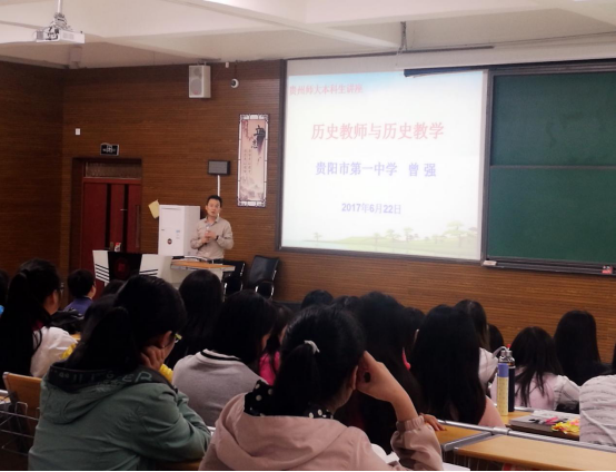 为促进人才培养模式改革,进一步提升师范生的理论素养和教学技能。6月27日下午,贵阳一中历史名师曾强应bb贝博艾弗森官方网站之邀,在GJ6201教室作了题为“历史教师与历史教学”的教学指导专题讲座。讲座由学院副院长蒲文彬主持,思想政治教育系主任陈群、历史学系主任苏聪出席,学院2014级、2015级本科师范生共300余人到场聆听。