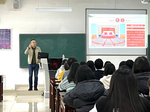 蒋雪明部长以“解读党的二十大精神”为主线,从“理解党的二十大主题”、“祖国十年发展期间的三件大事”、“解读二十大报告”三个方面带领同学们深刻领会和把握党的二十大的重要内容及重大意义。蒋部长在讲课过程中结合自身的求学经历,与同学们亲切地交流互动,让同学们对中国式现代化之下的大学生责任与担当有了更深刻的认识。