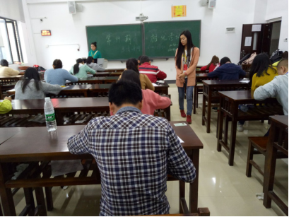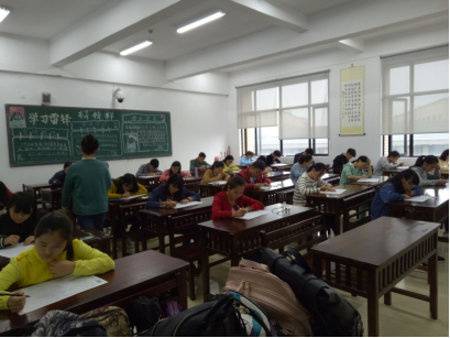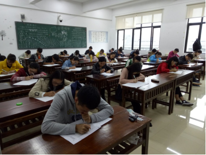 为保证考试的公平公正。实行单人单桌。每间教室都有两名学院党建办成员和一名研究生代表参与监考,并有学院领导老师巡视。在考试之前,参与考试的同学将自己的一卡通或学生证置于课桌左上角,便于监考人员检查。同时将自己的复习资料和书包放在教室最前方的空桌上。防止了作弊行为的发生。