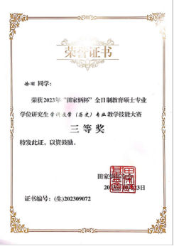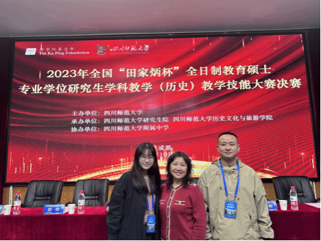 2023年10月20日至23日,第七届全国“田家炳杯”全日制教育硕士专业学位研究生学科教学(历史)教学技能大赛决赛在四川师范大学举办,贝博历史学系21级学科历史研究生徐丽、李进同学参加此次决赛。
