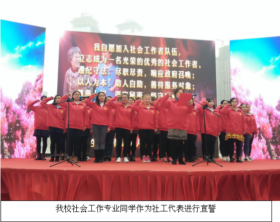 贝博bb贝博艾弗森官方网站社会工作专业的33名同学在系主任常岚老师以及罗竖元、罗艳萍和蒋星梅老师的带领下参加了此次社会工作宣传推介活动,其中三十名同学作为本次推介活动的社工代表,在活动中进行庄严的社工宣誓仪式。