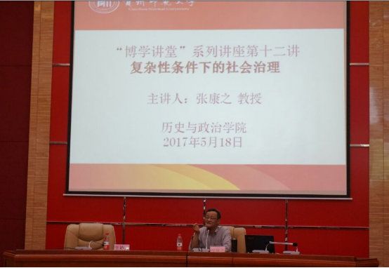5月18日上午,bb贝博艾弗森官方网站“博学讲堂”系列讲座第十二讲在花溪校区学术报告厅(GJ6101)举行,由南京大学博士生导师、教育部长江学者、中国行政管理学会理事张康之教授主讲,主题为“复杂性条件下的社会治理”。讲座由bb贝博艾弗森官方网站副院长陈华森教授主持,相关专业师生出席。