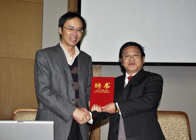 蔡永生副校长(右)为刘海峰颁发客座教授聘书