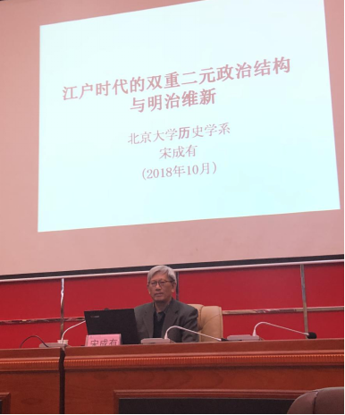 宋成有教授深刻解读了“江户时代的双重二元结构与明治维新”。他认为研究明治维新的重要方法是了解明治的上一个时代——江户时代,并阐述了江户时代将军至强与天皇至尊二元政治结构从失衡到明治时代改革的历史,全面分析了日本政治结构由二元转换到一元的历史进程,其历史教训值得汲取。