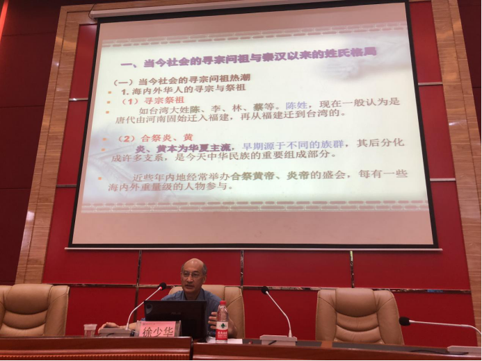 徐教授首先阐释了古代姓氏的源流,指出“姓”与“氏”具体含义的不同。他认为,“姓”是区别血缘的,是宗族的根本族号,所代表的是氏族的血统,是源于同一女性始祖的具有共同血缘关系的族属所共有的符号标志;“氏”是姓的支系,是姓族的分支标记,是源于同一父性始祖的被分出去的各支系(庶子)的开氏始祖的符号标志,是大氏族、部落、部落联盟的称呼。徐教授以姓与氏的区别为引,分析了血缘与地缘因素、姻亲制度对上古社会的结构与氏族社会的地域分布的影响。其次,徐教授详细介绍了古代族群融合与姓氏的流变,并举例指出社会形态对姓氏的诸多影响。最后,徐教授谈及当今社会的寻宗问祖热潮,从一些大姓(陈、林、李、张等)的追根溯源,炎、黄合祭盛会及家谱、族谱的兴修等历史传统,解析秦汉以来的姓氏格局和追宗溯源的社会条件和现实意义。他鼓励大家积极了解自己姓氏来源及流变,关注家族历史,慎终追远,饮水思源。
