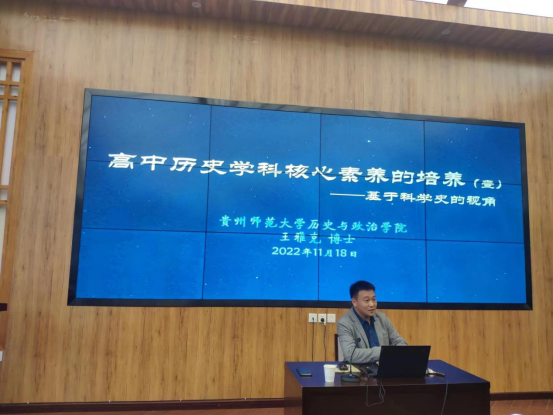 本次“高中历史学科核心素养的培养(壹)——基于科学史的视角”的讲座系贵州师范学院印山讲坛系列之第十八期。王老师以《普通高中历史课程标准(2020版)》为依托,以历史学科五大核心素养中的时空观念为例,讲解了如何从科学史的角度培养学生的时空观念。作为历史学的分支学科之一,科学史的研究对象、研究内容、研究方法等都是在特定的历史时空中展开的。同时,科学史也是高中历史教学中的重要内容。王老师的分享从时空观念的内涵、科学史的学科特质,时空观念与学科特质的融合几个方面展开,同时结合《中外历史纲要》(上下)以及高考试卷中的科学史内容进行了讲解,指出科学史内容的讲授,在学生时空观念培养、科学素养和人文素养的提升过程中,有着不可替代的重要价值和实践意义。