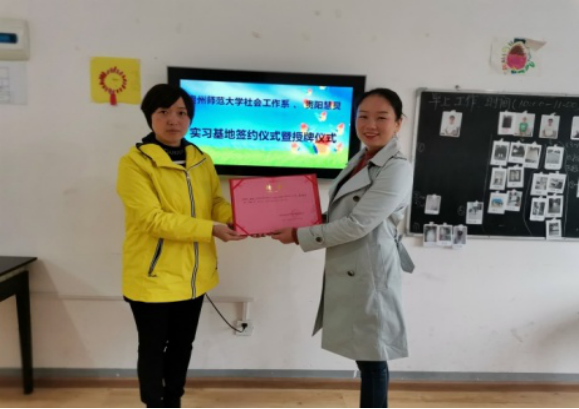 其次,社会工作系与贵阳市慧灵社会工作服务中心签订“共建实习实训基地协议”,并进行实习基地挂牌。同时聘请黄习老师担任学生“实习督导”。