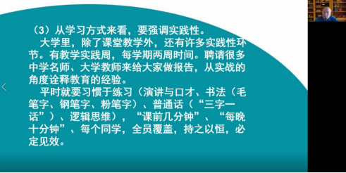 刘老师结合自己从教多年的经验,从“我们准备度过一个怎样的大学四年?”、大一新生规划、如何养成良好的学习习惯并掌握正确的学习方法、历史系学生学习方法、记好笔记的方法、记忆方法等几个方面为大一新生讲述良好学习习惯养成的意义及历史系学生学习的方法,刘老师还对2022级历史学新生寄予希望,希望他们从现在抓起,养成良好的学习习惯、记课堂笔记和读书笔记的习惯以及独立思考的精神。与会同学均表示从中受益匪浅,以后会养成良好的学习习惯,掌握正确的学习方法,夯实基础知识,培养创新思维能力,努力成为祖国未来合格的接班人。