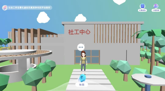 此次比赛依托陆由社会工作仿真对抗平台软件进行,模拟某城市民政局面向多家社工机构招投标的过程。软件构建了3D全景立体真实的社区,场景丰富,包括政府大楼、社工机构、医院、学校、公安局、福利院、党建中心、操场、停车场、体育中心等。学生分为14组,分别模拟一家社工机构进行投标,组内实现在线协作,组与组之间实现在线竞争对抗,通过多个回合的投标来实现机构的可持续运营与发展。