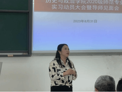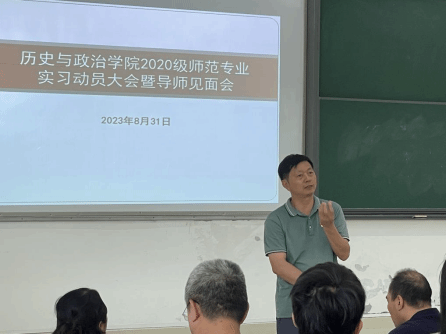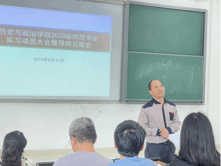 2023年8月31日下午14:00,学院在东校区GJ6402教室开展了2020级“师范生教育实习岗前培训课程”第一场暨“历政学院2020级师范专业实习动员大会暨导师见面会”。学院党委书记帅永平、院长陈华森、副院长伍志燕、历史学系主任刘刚、思政系主任龚春芳、教师代表陈彦、2020级辅导员刘邕、教学秘书王昌燕等老师出席此次大会,2020级历史学、思想政治教育两个专业全体同学到场聆听,由历史学系主任刘刚老师主持本次大会。