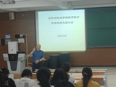 在历经了一周的教育实习岗前培训之后,2023年9月8日下午,学院在东校区GJ6202教室召开2020级师范专业教育实习岗前培训总结大会,对阶段性的培训课程进行总结。历史学系主任刘刚、思政系主任龚春芳老师出席了总结大会,2020级历史学、思想政治教育专业的全体同学参加了此次大会,刘刚老师主持本次大会。