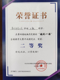 贝博历史学系认真做好校级选拔赛,组建了强大的教学指导团队,指导学生积极备赛,历史学系2021级历史学专业王毅同学在大赛中表现突出,斩获全国大赛二等奖。同时,两位指导教师刘刚、王雅克老师也获得“优秀指导教师”荣誉称号。在此,向王毅同学和两位指导教师表示热烈祝贺。