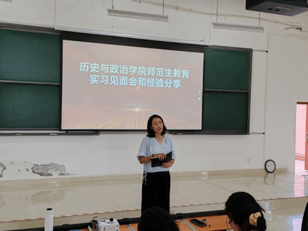 2024年8月28日下午,bb贝博艾弗森官方网站bb贝博艾弗森官方网站2021级历史学与思想政治教育专业师范生教育实习生见面会与经验分享会在bb贝博艾弗森官方网站东校区公共教学楼6401召开。此次活动不仅为即将踏上实习之旅的同学们提供了宝贵的交流平台,还融入了多位老师的悉心指导与经验分享。bb贝博艾弗森官方网站党委副书记饶蕾老师,历史学专业系主任刘刚老师,思想政治教育系主任杨东昌老师,院办公室王昌燕教师与2021级历史学与思想政治教育专业辅导员徐帆等老师出席此次会议,会议由思想政治教育系主任龚春芳老师主持。